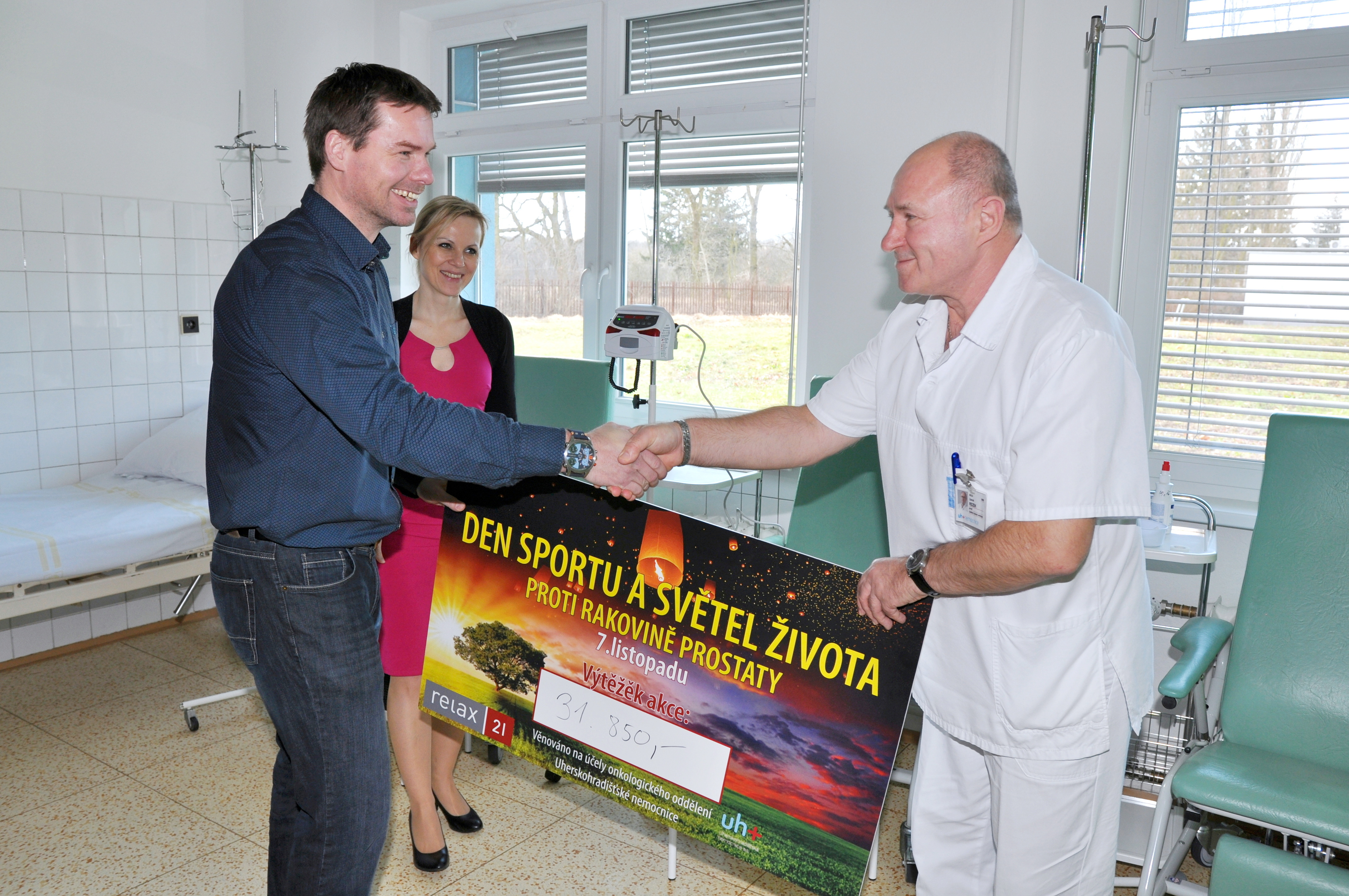 Zástupci fitness RELAX 21 Uherský Ostroh předali symbolický šek primáři onkologie UHN MUDr. Zdeňku Rezkovi. Celkovou částku 31 850 Kč vybrali ve fitness v rámci akce Den sportu a světel života proti rakovině prostaty.