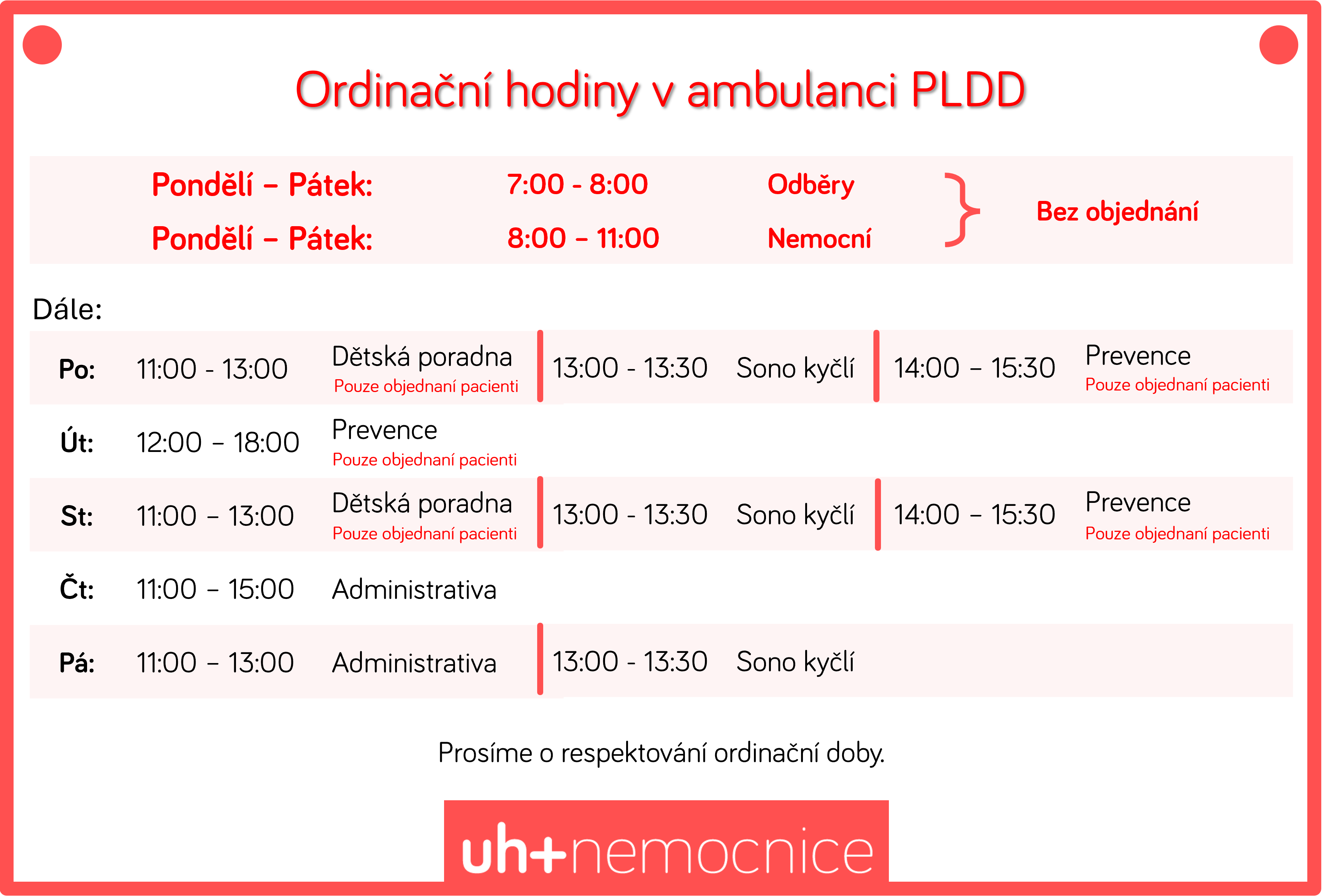 Od 1. 8. 2024 ukončením činnosti ambulance Pediatr Polešovice s.r.o. přecházejí pacienti, kteří si nenašli svého PLDD pod ambulanci PLDD Uherskohradišťské nemocnice.