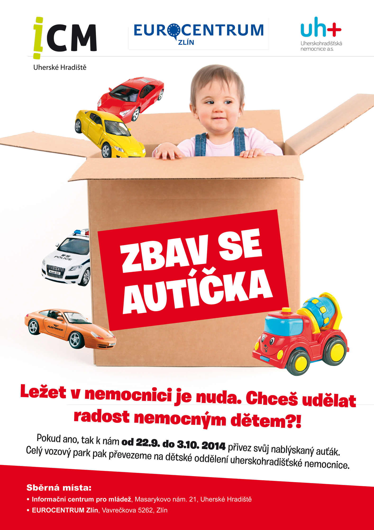 Autíčka sbírá samotné Informační centrum pro mládež v Uherském Hradišti (Masarykovo náměstí, bývalý Dům služeb) a také Eurocentrum Zlín. Zájemci mohou přinést jakákoliv auta na hraní. "Chceme udělat radost malým pacientům, pro které je pobyt v nemocnici často dlouhý. Budou si ho moci zpestřit sesbíranými autíčky," uvedl Josef Pavela z Informačního centra pro mládež. Sbírka končí 3. října, autíčka pak poputují na dětské oddělení Uherskohradišťské nemocnice.