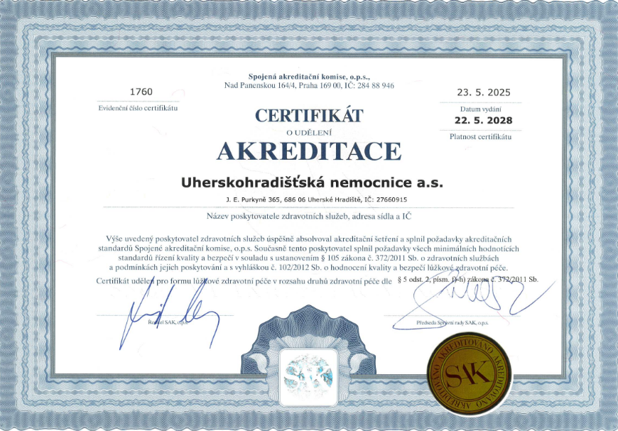 V budování systému kvality se Uherskohradišťská nemocnice rozhodla projít procesem přípravy k akreditaci dle standardů Spojené akreditační komise, o.p.s. (dále jen SAK), určených přímo pro oblast zdravotnictví. V roce 2025 pak UHN získala už po čtvrté Certifikát kvality udílený SAK na základě akreditačního šetření (poprvé v roce 2016 jako vůbec první zdravotnické zařízení ve Zlínském kraji).