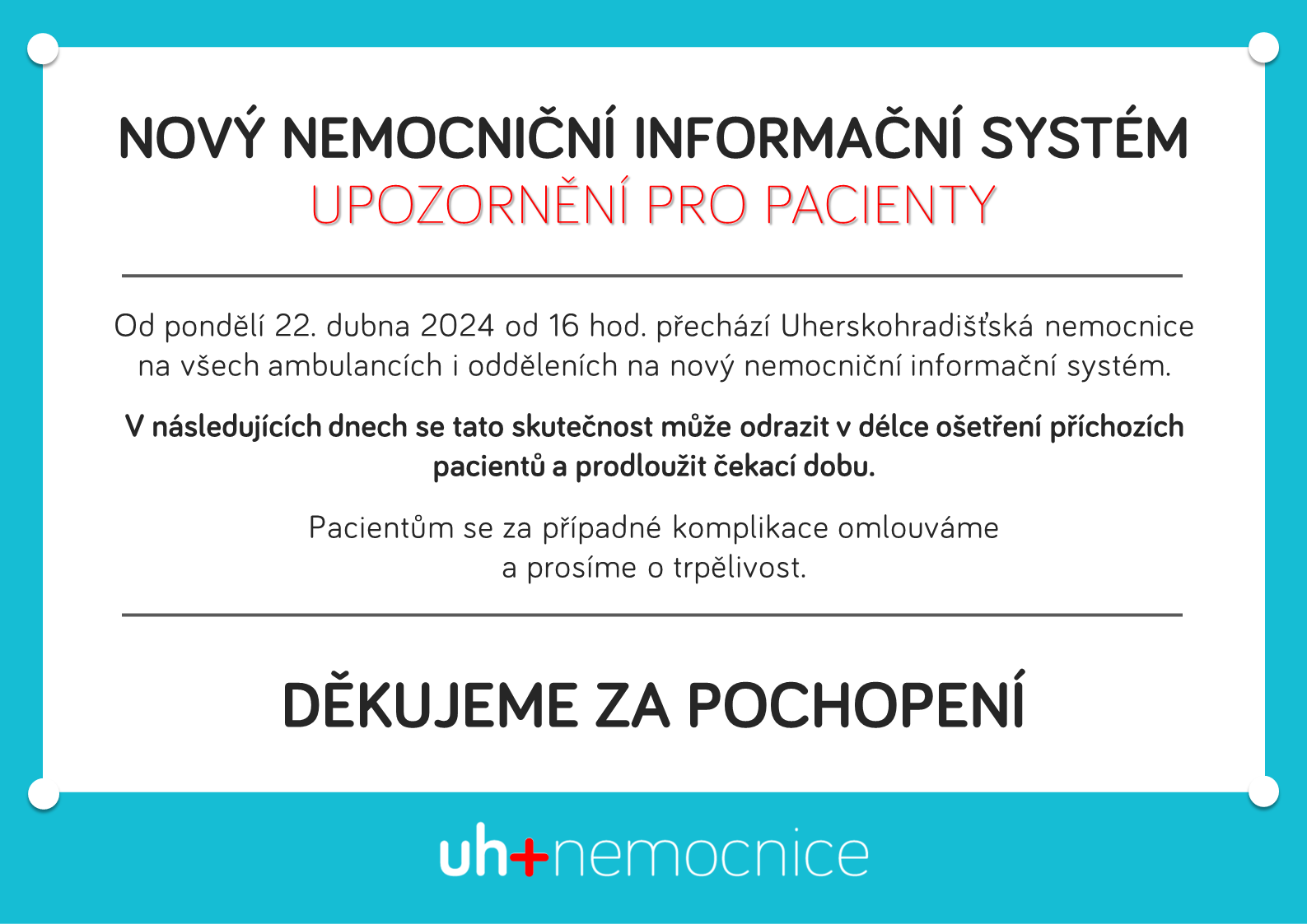 Od pondělí 22. dubna 2024 od 16 hod. a v úterý 23. dubna 2024 do 6 hod. přechází Uherskohradišťská nemocnice na všech ambulancích i odděleních na nový nemocniční informační systém.