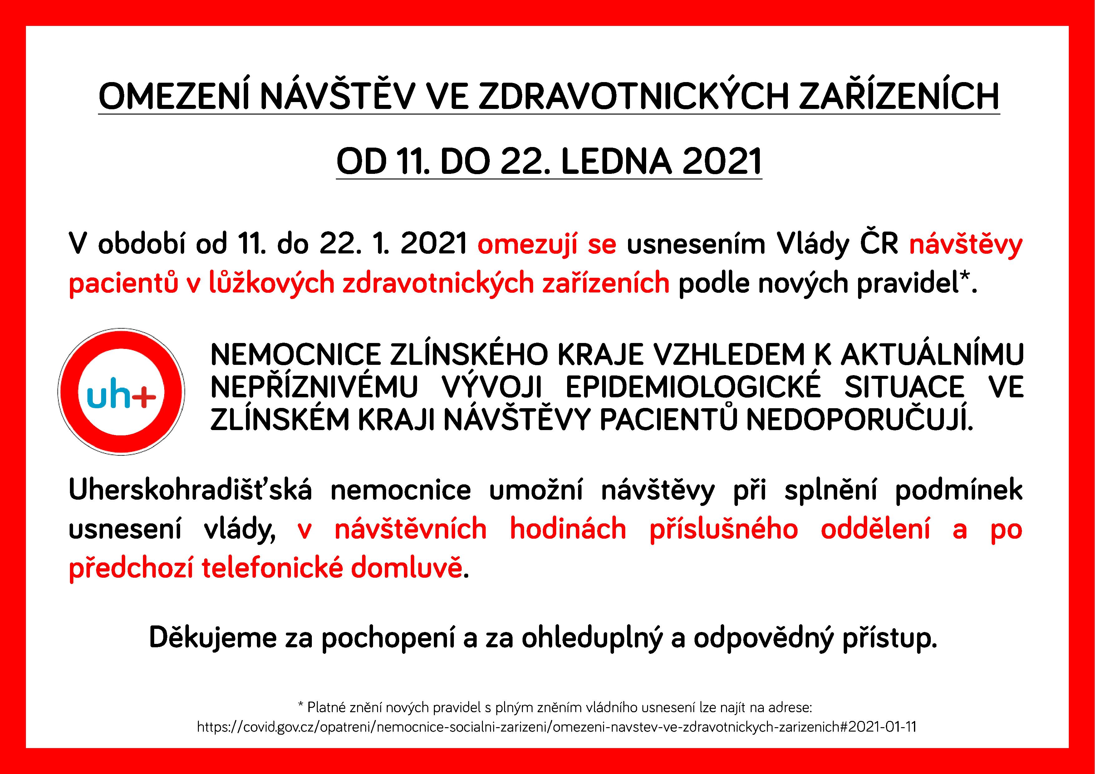V období od 11. do 22. 1. 2021 omezují se usnesením Vlády ČR návštěvy pacientů v lůžkových zdravotnických zařízeních podle nových pravidel*. NEMOCNICE ZLÍNSKÉHO KRAJE VZHLEDEM K AKTUÁLNÍMU NEPŘÍZNIVÉMU VÝVOJI EPIDEMIOLOGICKÉ SITUACE VE ZLÍNSKÉM KRAJI NÁVŠTĚVY PACIENTŮ NEDOPORUČUJÍ.