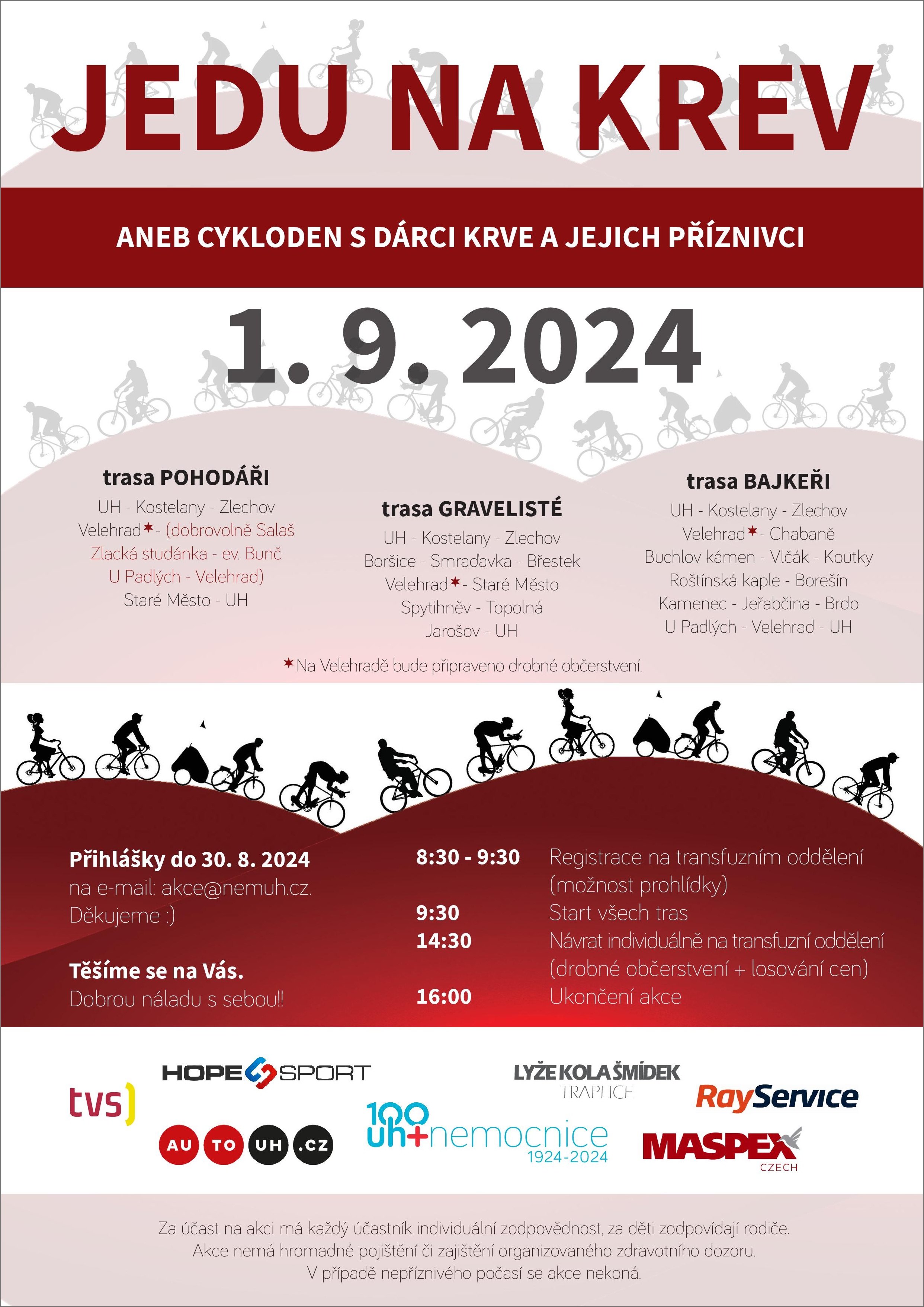 Kratší trasa nese podtitul „pohodáři“, pro milovníky jízdy na zpevněných cestách je připravena trať „gravelisté“, okruh pod názvem „bajkeři“ ocení především fandové terénní jízdy. Registrace účastníků proběhne první zářijovou neděli od 8:30-9:30 hod. před transfuzním oddělením. Pro všechny příznivce cyklistiky bude připraveno malé občerstvení, v závěru akce se bude losovat o krásné ceny.