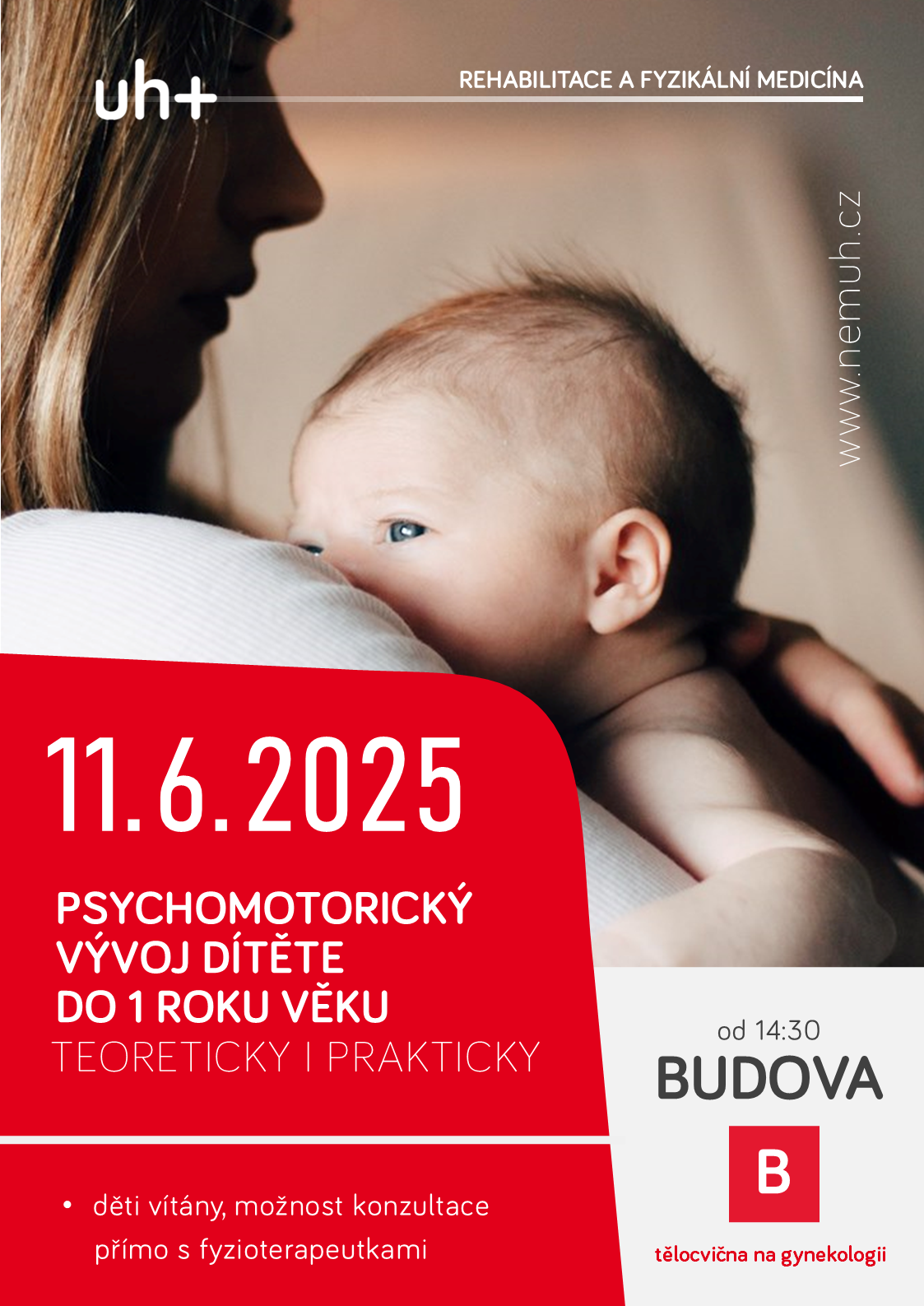 Rok mateřství v Uherskohradišťské nemocnici otevírá nejrůznější témata, která se netýkají jen samotného počátku života, ale provází maminky a rodiny i během růstu dětí. Oddělení rehabilitace a fyzikální medicíny proto připravilo speciální seminář zaměřený na psychomotorický vývoj kojence do 1 roku. Uskuteční se ve středu 11. června od 14.30 v prostorách tělocvičny v budově B.