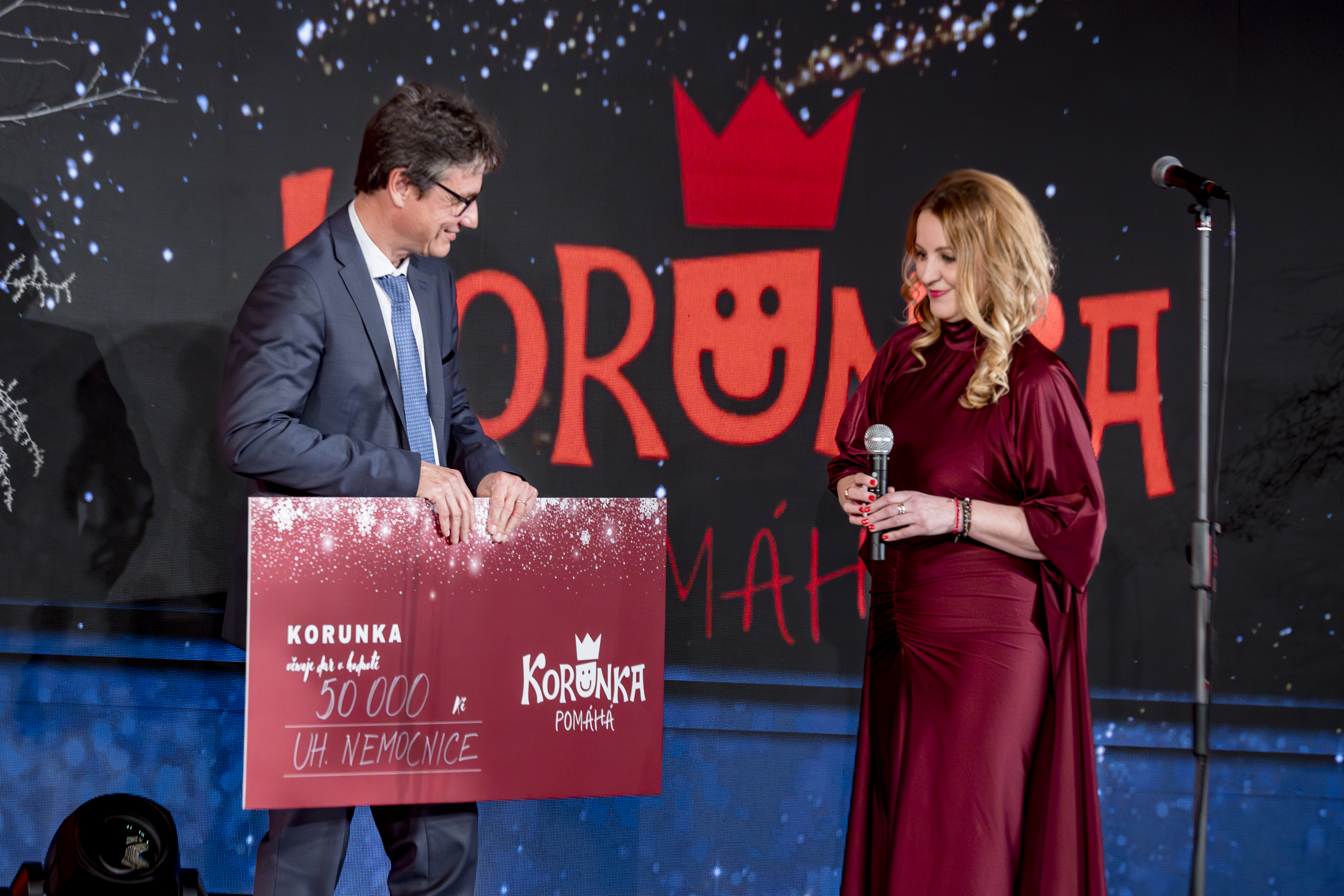 O víkendu se v Luhačovicích uskutečnil Vánoční koncert dětem, za kterým stojí charitativní projekt Korunka pomáhá. Ten je nablízku nejen handicapovaným, nemocným nebo jinak znevýhodněným dětem, ale například i seniorům, a svou pomoc už poněkolikáté posílá i do Uherskohradišťské nemocnice. Jeho duší i srdcem je Veronika Crha Záhorská, která na zmíněném koncertě předala šek na 50 000 Kč předsedovi představenstva nemocnice MUDr. Petru Sládkovi.