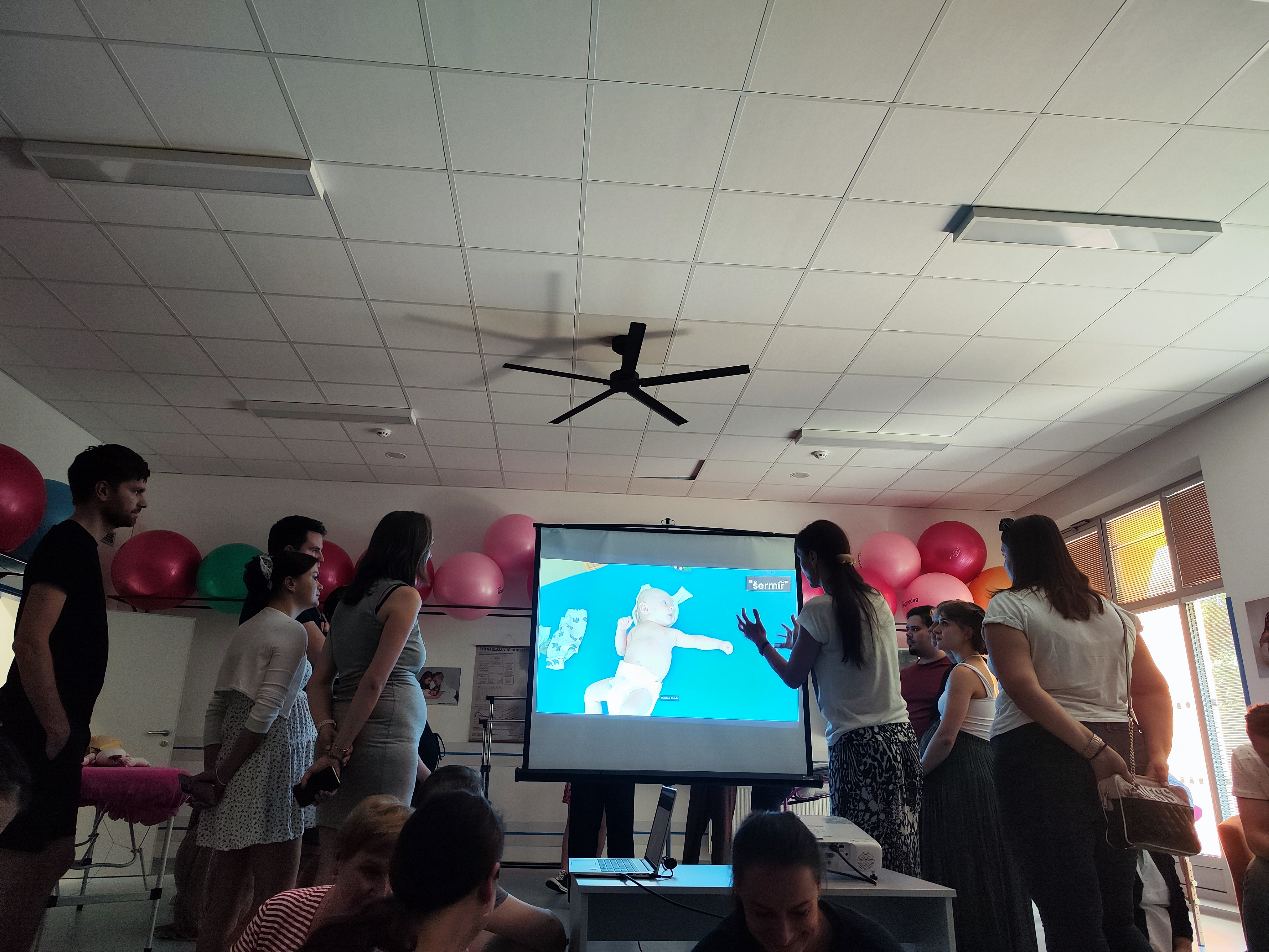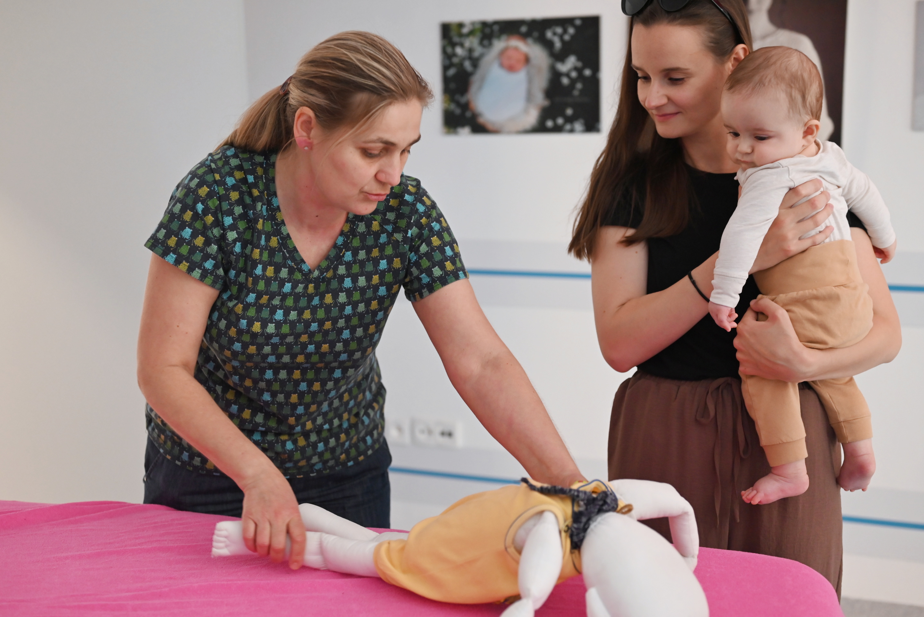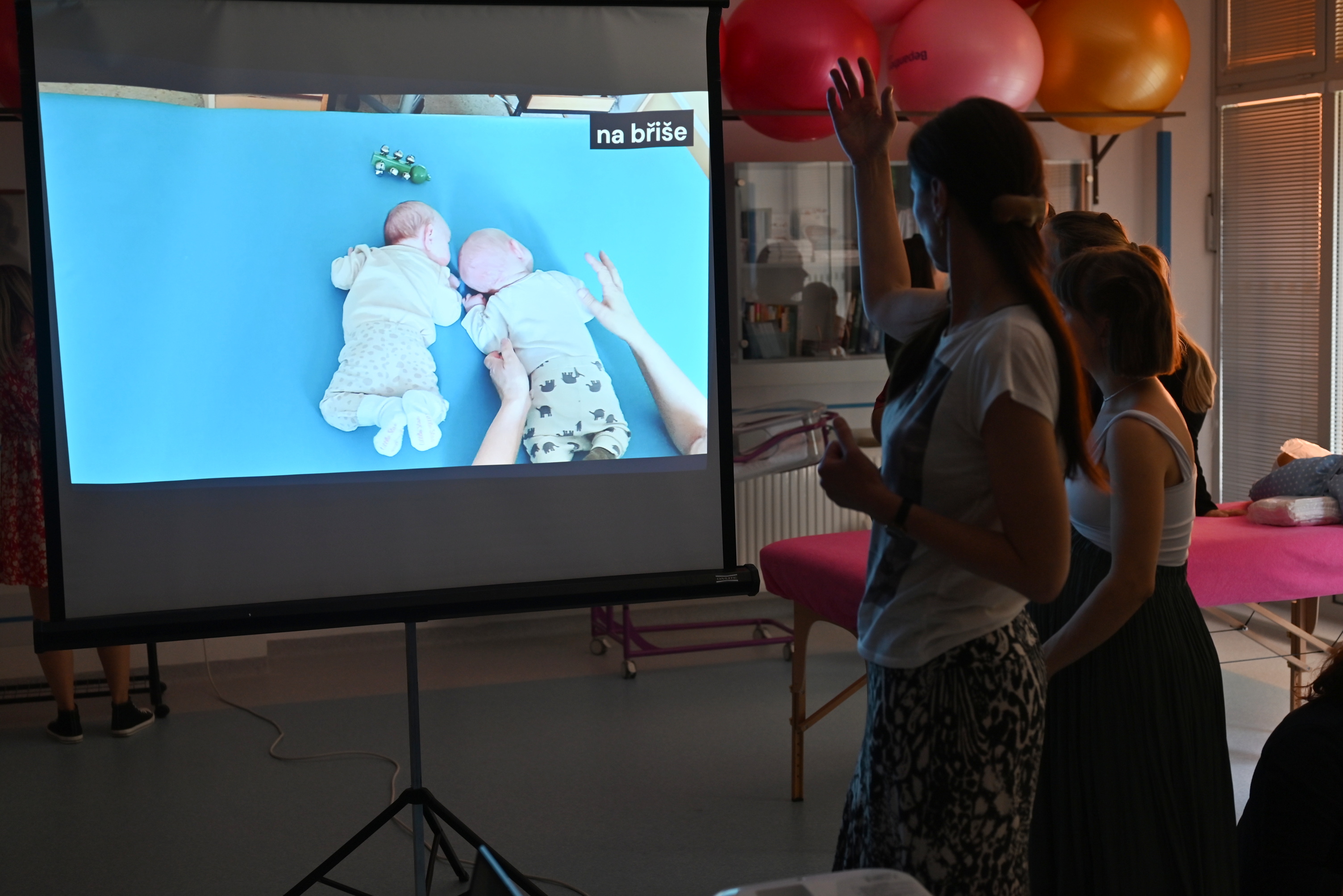 V praktické části se spolu s přítomnými fyzioterapeutkami věnovala rodičům individuálně při konzultacích konkrétních otázek přítomných a ukázkách správné manipulace s děťátkem.
